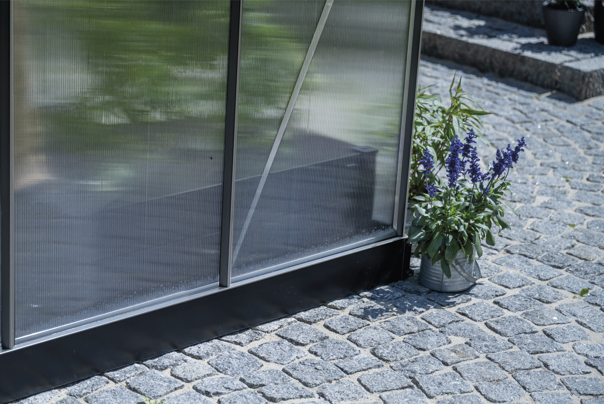 Special details such as the innovative G-clips (standard with toughened glass in long panes and horticultural glass; polycarbonate in long panes is supplied with regular glazing clips) ensure secure glazing, while the optimised roof pitch improves the rain and snow clearance capability. The wide gutters are prepared for rainwater harvesting — a plus for the environmentally conscious gardener.